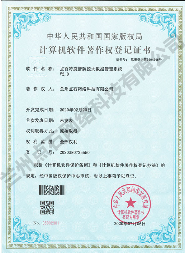 近日,由我公司自主設(shè)計與研發(fā)的一項軟件產(chǎn)品:點百特疫情防控大數(shù)據(jù)管理系統(tǒng)V2.0,榮獲國家版權(quán)局計算機軟件著作權(quán)登記證書。