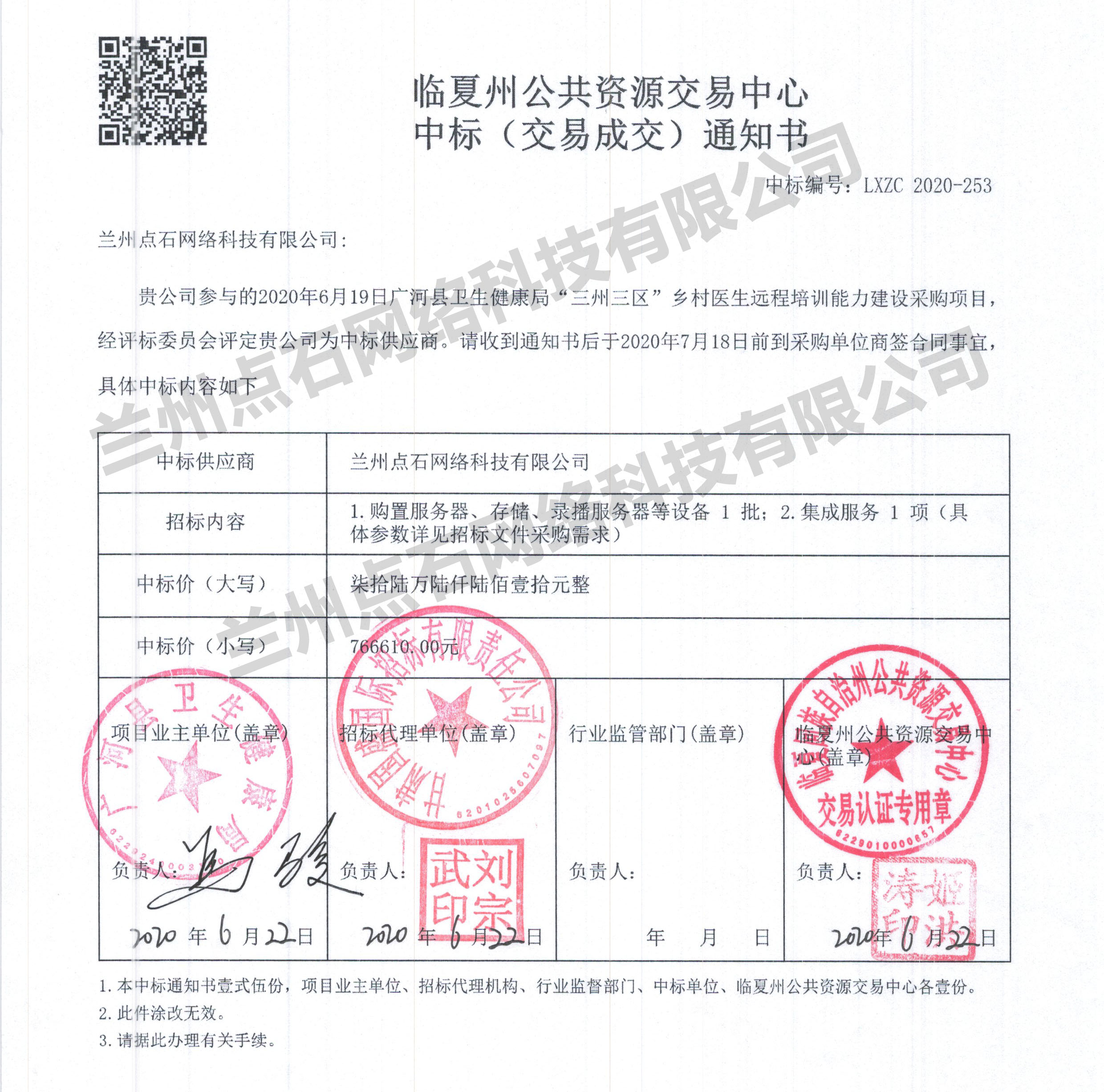 蘭州點(diǎn)石網(wǎng)絡(luò)科技有限公司近日捷報(bào)頻傳,繼2020年6月17日中標(biāo)永靖縣醫(yī)療衛(wèi)生“一站式”服務(wù)和區(qū)域遠(yuǎn)程醫(yī)療中心建設(shè)項(xiàng)目后,一鼓作氣,乘勝追擊,憑借良好的公司信譽(yù)和可靠的技術(shù)力量,成功中標(biāo)廣河縣衛(wèi)生健康局“三州三區(qū)”鄉(xiāng)村醫(yī)生遠(yuǎn)程培訓(xùn)能力建設(shè)采購(gòu)項(xiàng)目。
