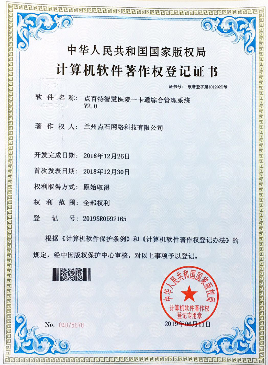 近日,我公司自主設(shè)計(jì)與研發(fā)的一款軟件產(chǎn)品——“點(diǎn)百特智慧醫(yī)院一卡通綜合管理系統(tǒng)”——獲得國(guó)家版權(quán)局計(jì)算機(jī)軟件著作權(quán)登記證書(shū)。